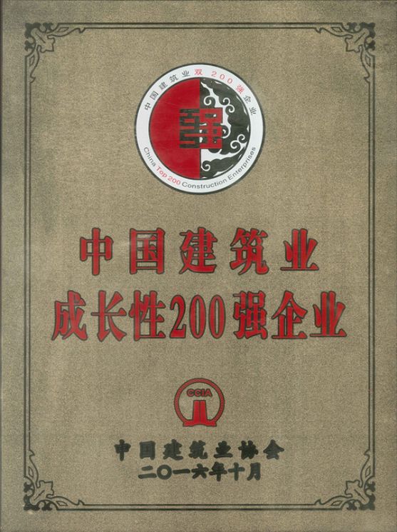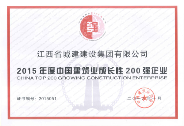 2016年10月中国建筑业协会授予江西省城建建设集团有限公司2015年度中国建筑业成长性200强企业。